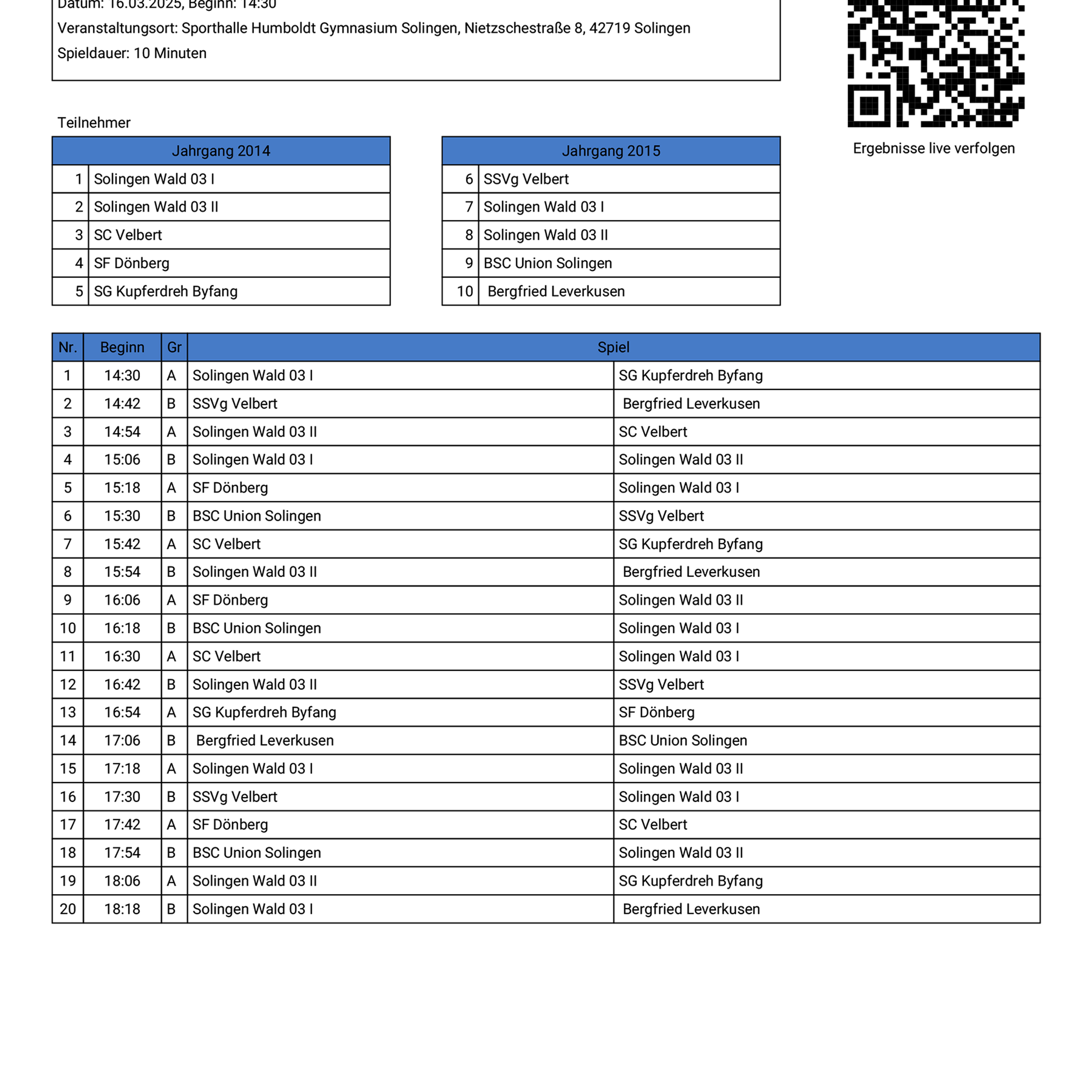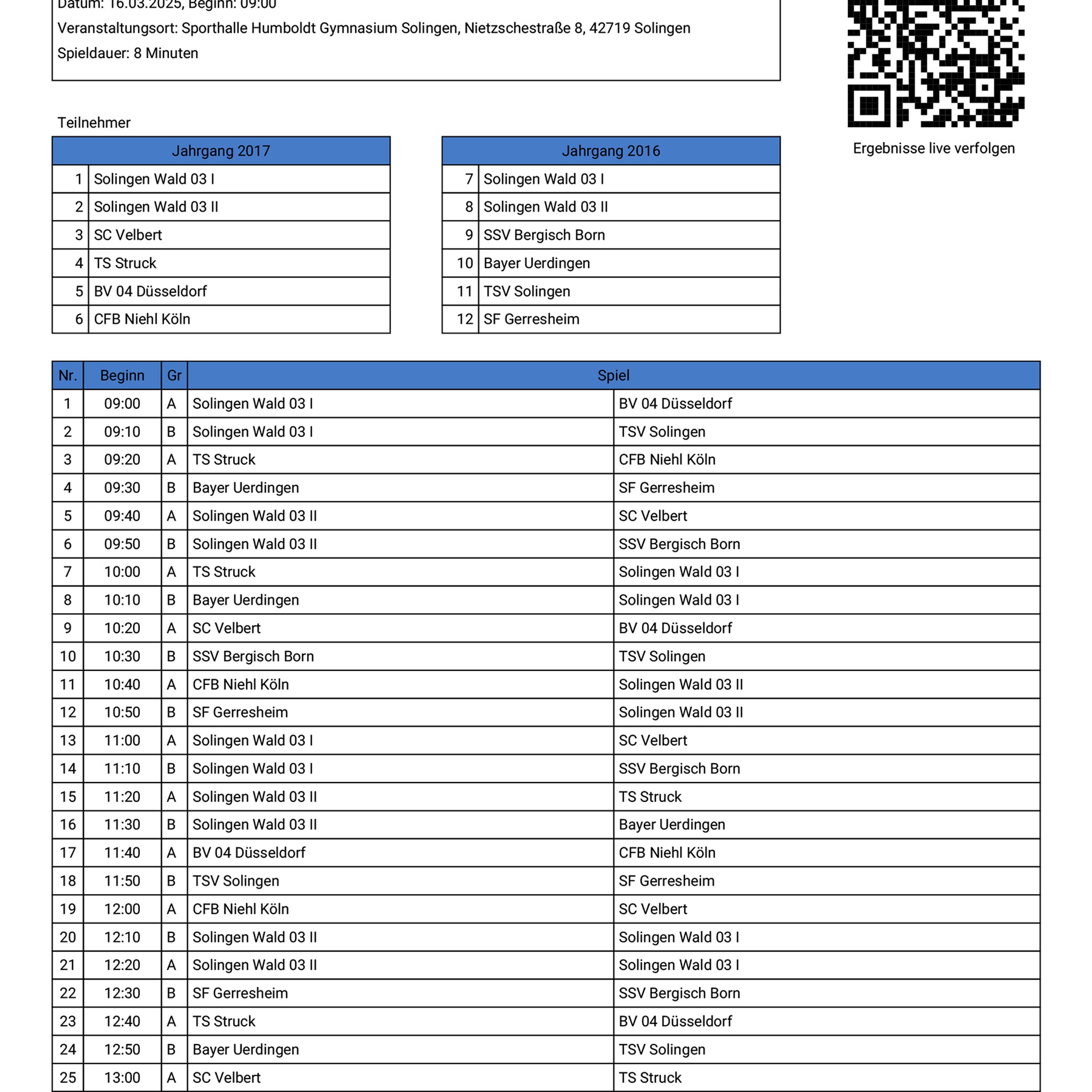 Zehn Mannschaften, darunter prominente Vereine wie Fortuna Düsseldorf, Alemannia Aachen, Rot-Weiß Essen, Wuppertaler SV und MSV Duisburg, kämpfen ab 10:00 Uhr um den Wanderpokal.