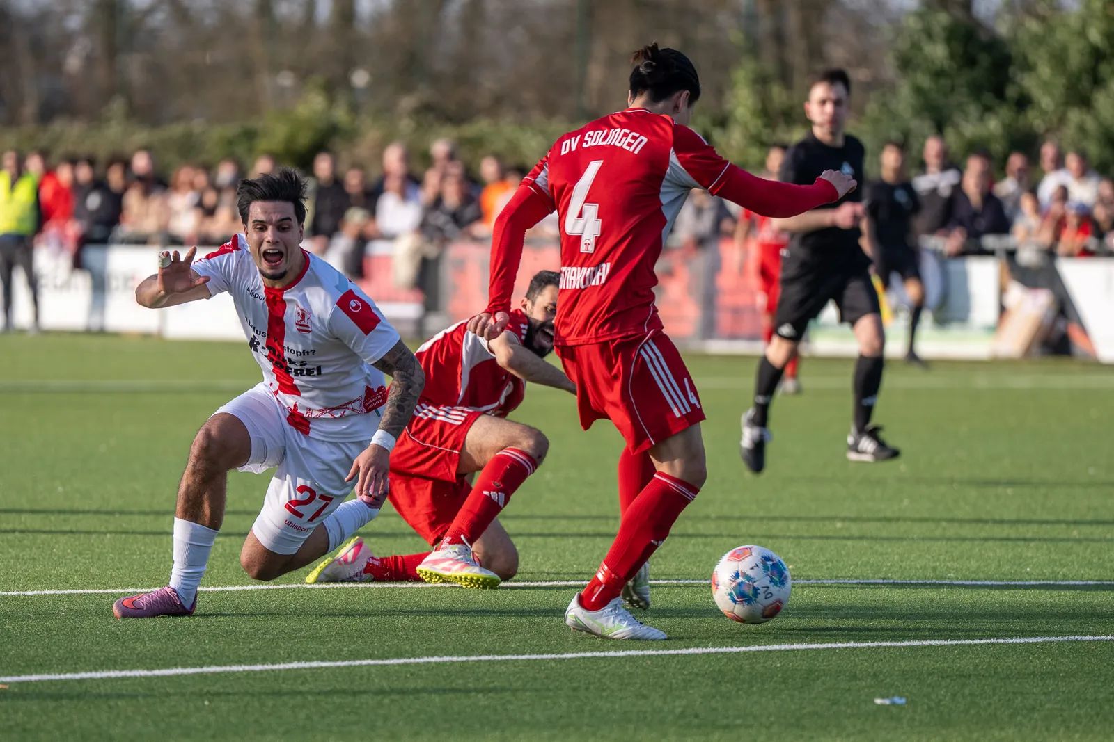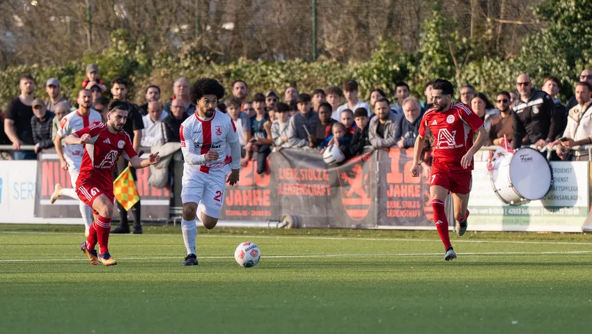 Wir agierten kurzzeitig ungeordnet und DV Solingen kam zu weiteren Möglichkeiten. In der 71. Minute fiel dann der Ausgleich. Nach einer kurzausgeführten Ecke verteidigten wir diese Situation nicht gut, waren im Zentrum weder sortiert noch mannorientiert, sodass El Fahmi frei aus fünf Metern zum 2 : 2 einschieben konnte. In der Schlussphase spielte DV nach zwei Gelb-Roten Karten nur noch mit 9-Mann, leider konnten wir die Überzahl nicht mehr nutzen.
